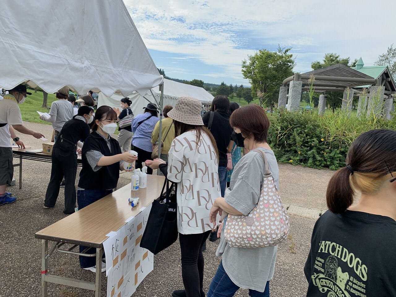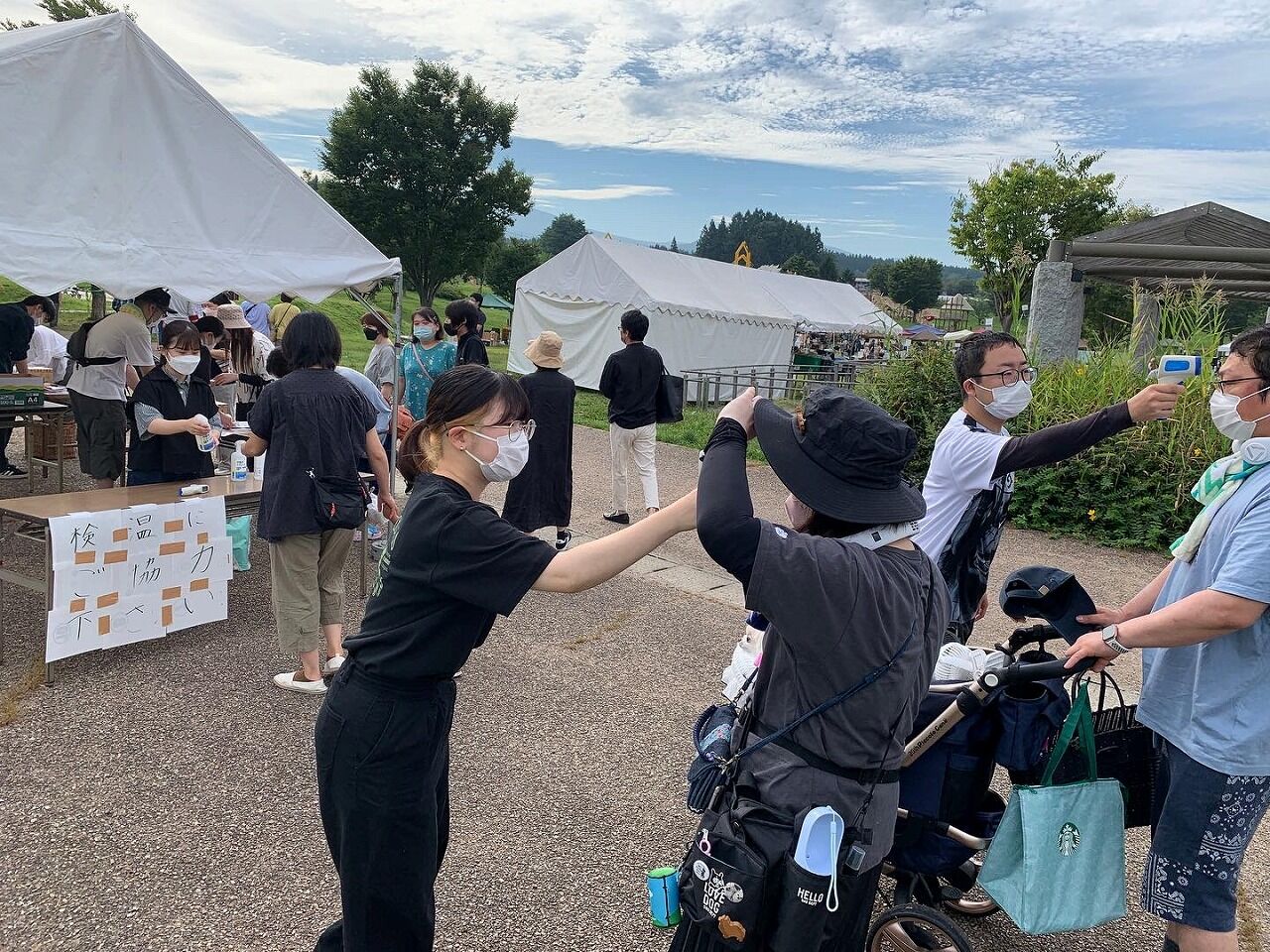 こちらは会場入り口近くに設置された、検温、消毒、連絡先記入のためのテント。