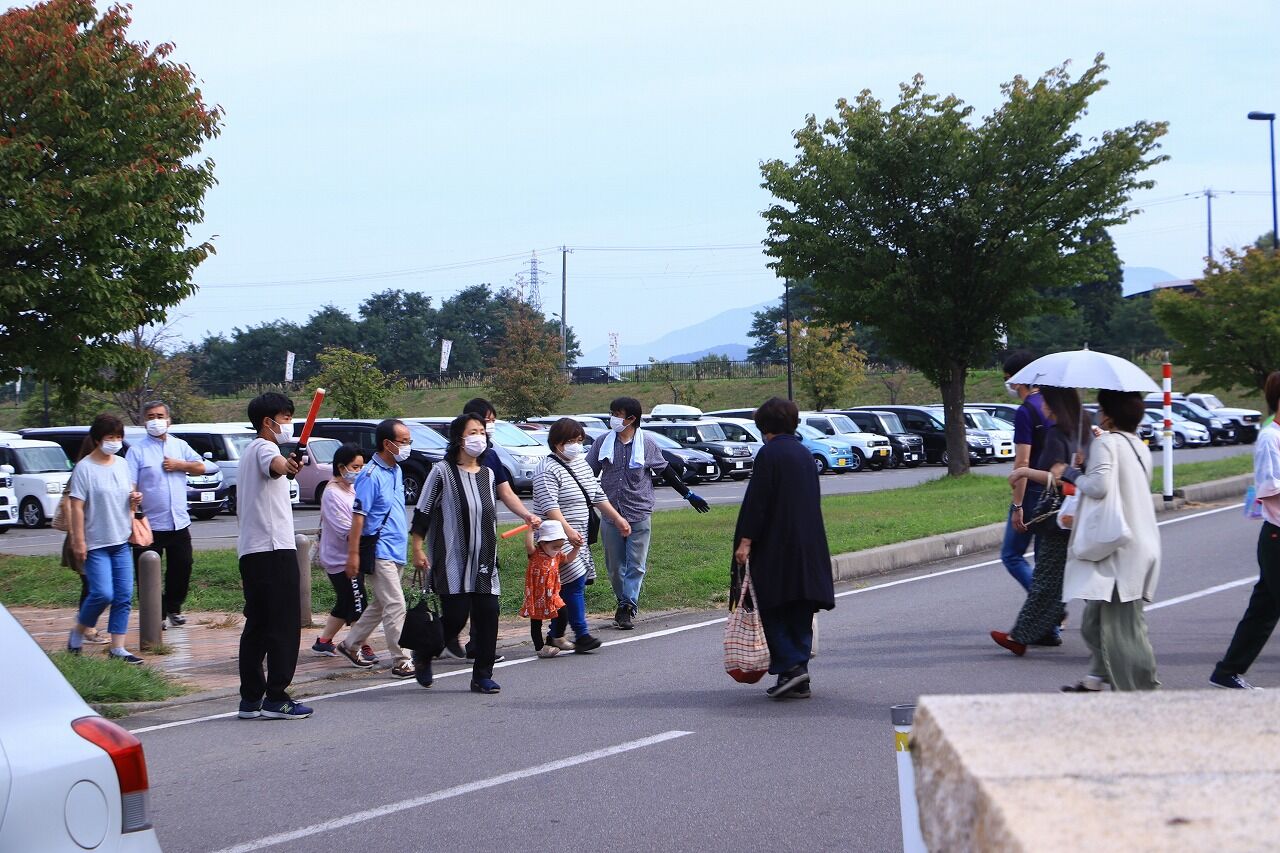 駐車場からは、こちらの誘導員のいるところから公園に入ってください。